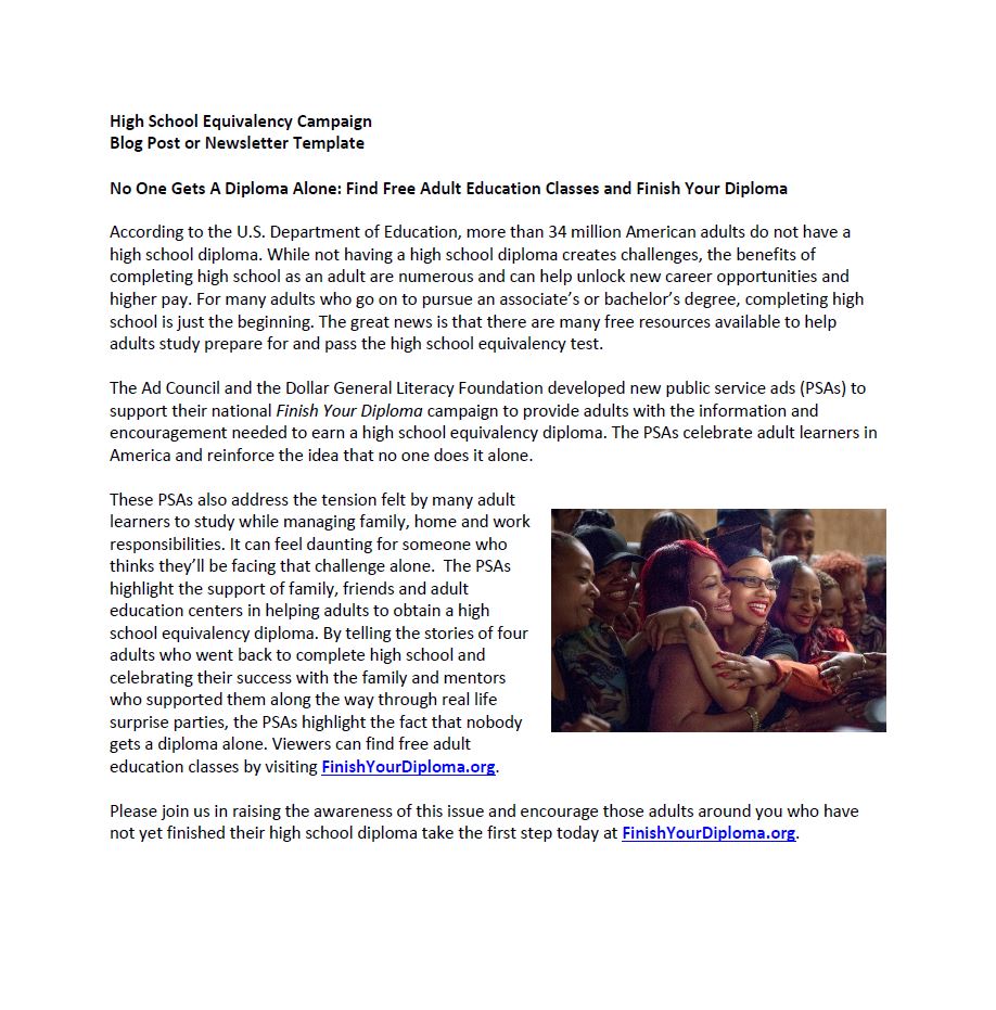 Language provided to promote the Finish Your Diploma campaign through blog posts, organizational newsletters, and other opportunities.