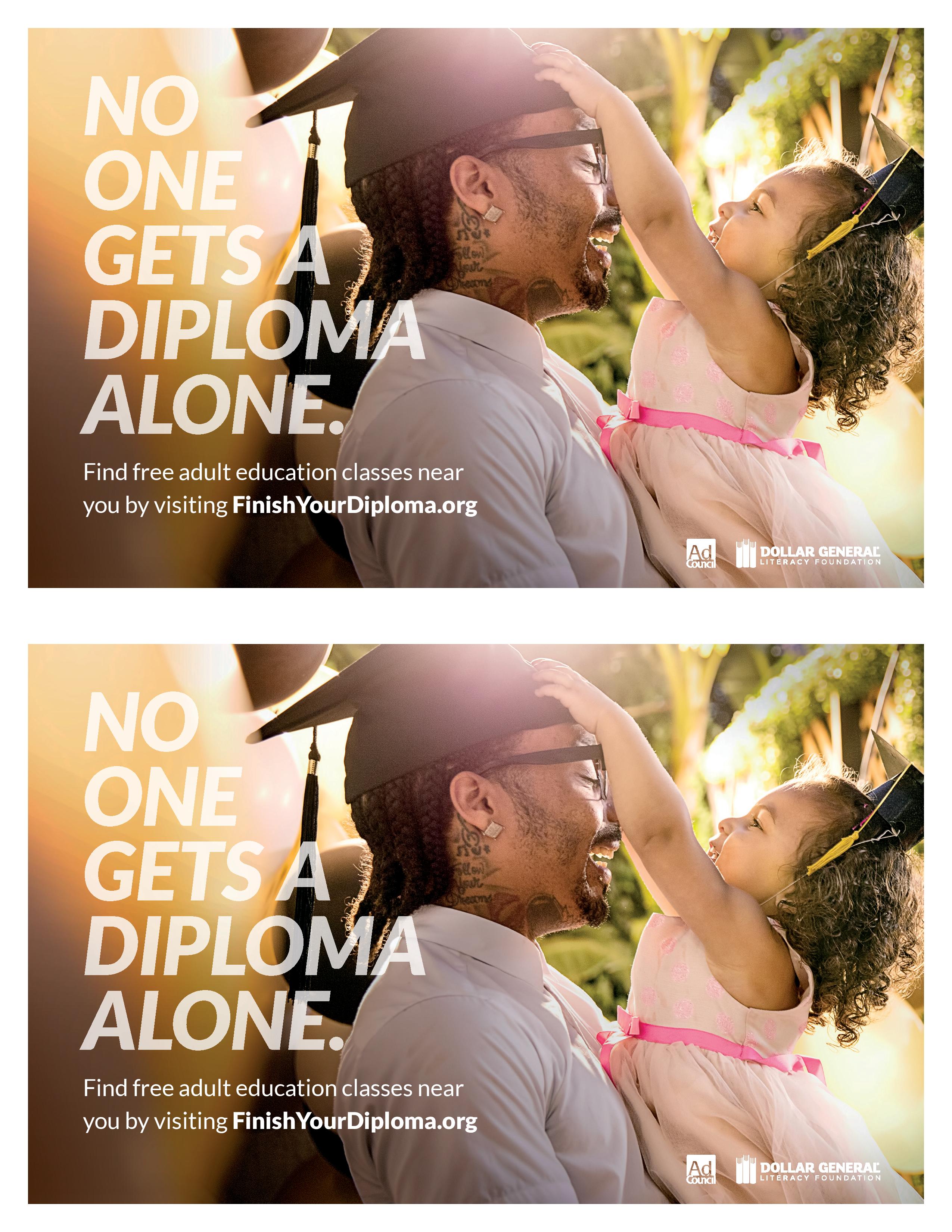 Print this 8.5x11" Finish Your Diploma poster for use at events, education centers, workshops, or any other local activations. The poster is available in English and cannot be customized.